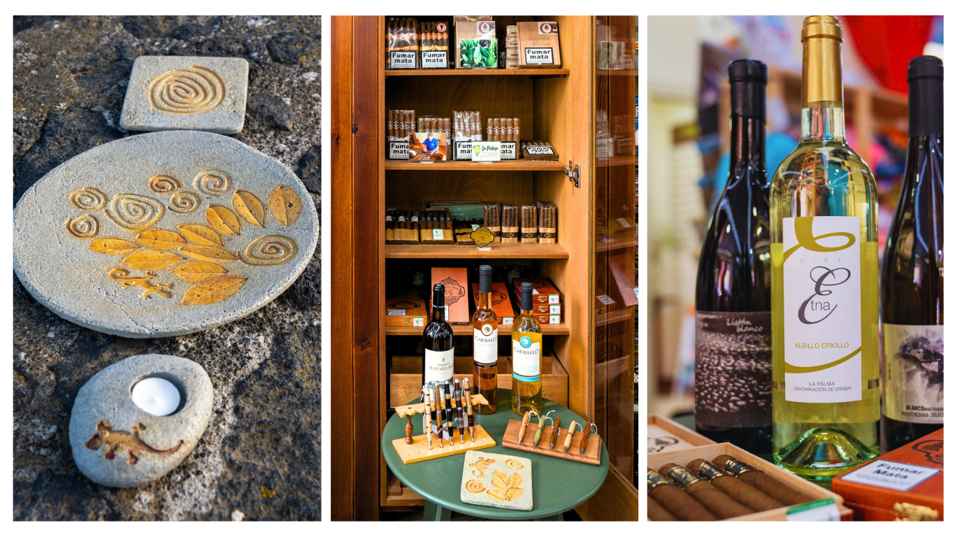 • Zona de artesanía y productos locales: espacio dedicado a la exposición y venta de artesanía tradicional (cestería, cerámica, bordados) así como productos alimentarios típicos de La Palma (mojos,vinos, quesos, mieles, licores, tés y más).